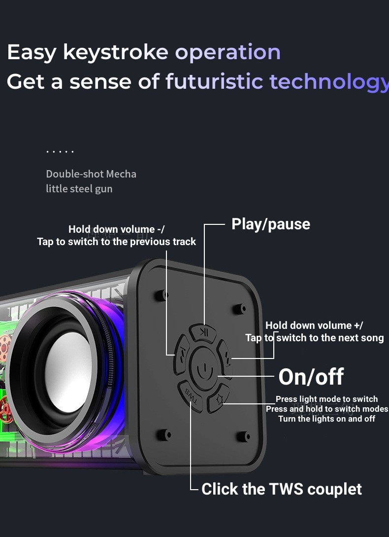 -Diseño único de mecanismo transparente: El altavoz portátil ofrece una experiencia visualmente impresionante con un efecto multidimensional gracias a su diseño único y transparente.