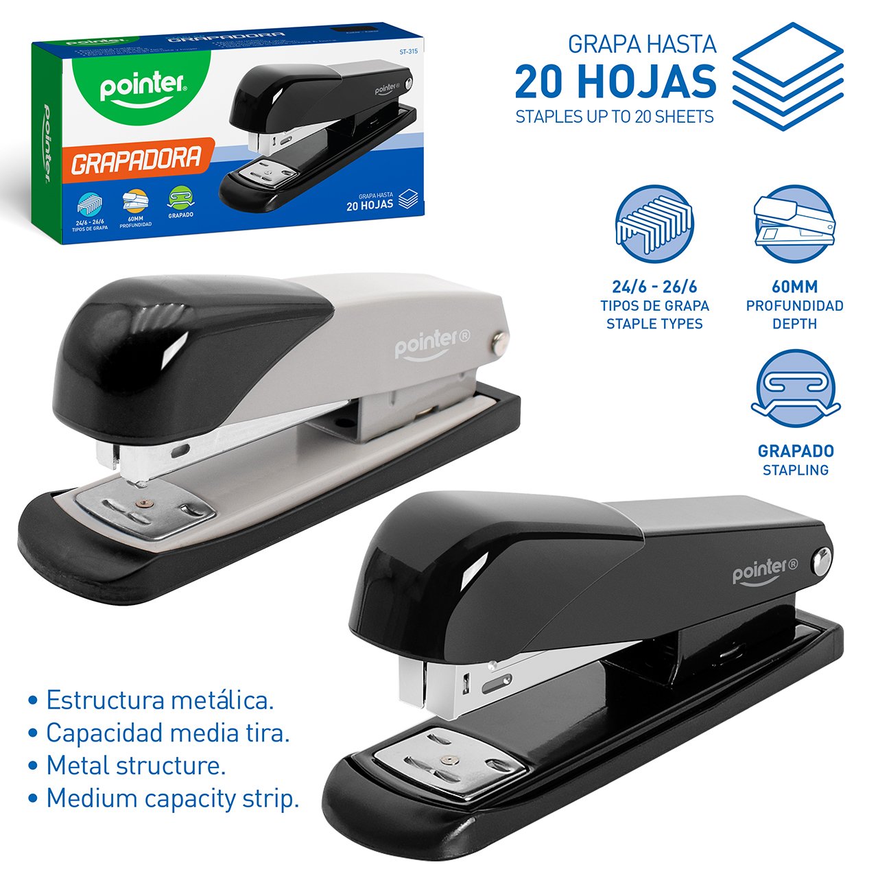 Presentamos la Engrapadora Mediana Pointer, una herramienta robusta y confiable diseñada para satisfacer tus necesidades de engrapado diario. Con capacidad para utilizar grapas 24/6 y 26/6, la habilidad de engrapar hasta 20 hojas (60mm), y su cuerpo de metal resistente, esta engrapadora se destaca por su durabilidad y versatilidad.