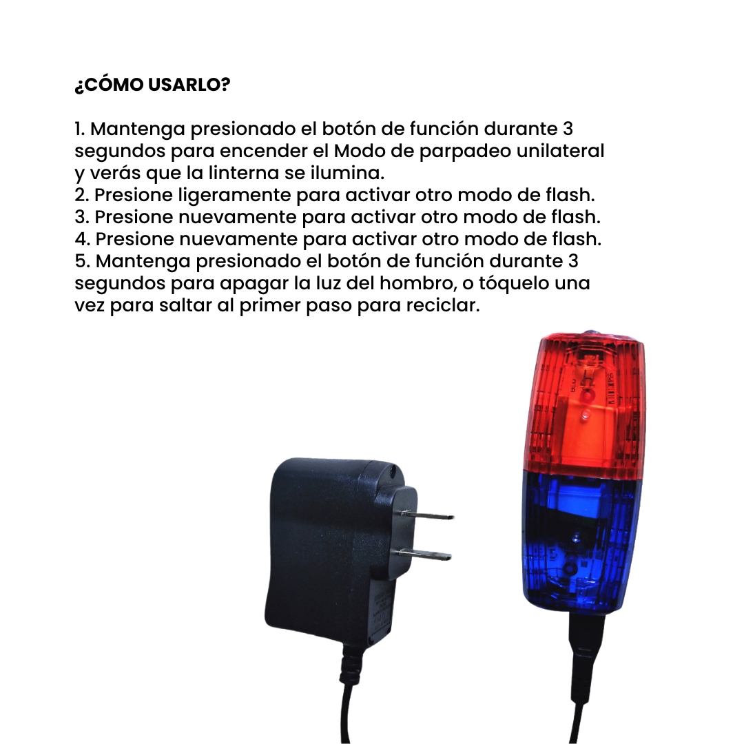 Este es un dispositivo de emergencia diseñado para proporcionar visibilidad y seguridad en situaciones críticas. Este accesorio innovador se coloca en el hombro y ofrece una potente fuente de luz que ayuda a los agentes policiales a ser más visibles y a dirigir la atención en áreas de riesgo.