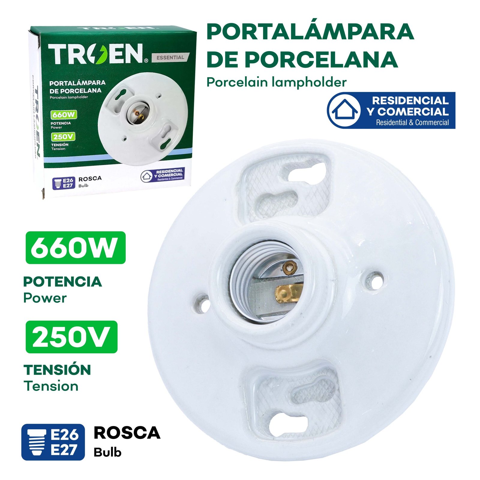 La Roseta para Bombillos de Porcelana de la marca Troen es una base confiable y duradera para la iluminación del hogar. Con una capacidad de hasta 660W a 250V, esta roseta está diseñada para proporcionar una conexión segura y estable para bombillos estándar.
