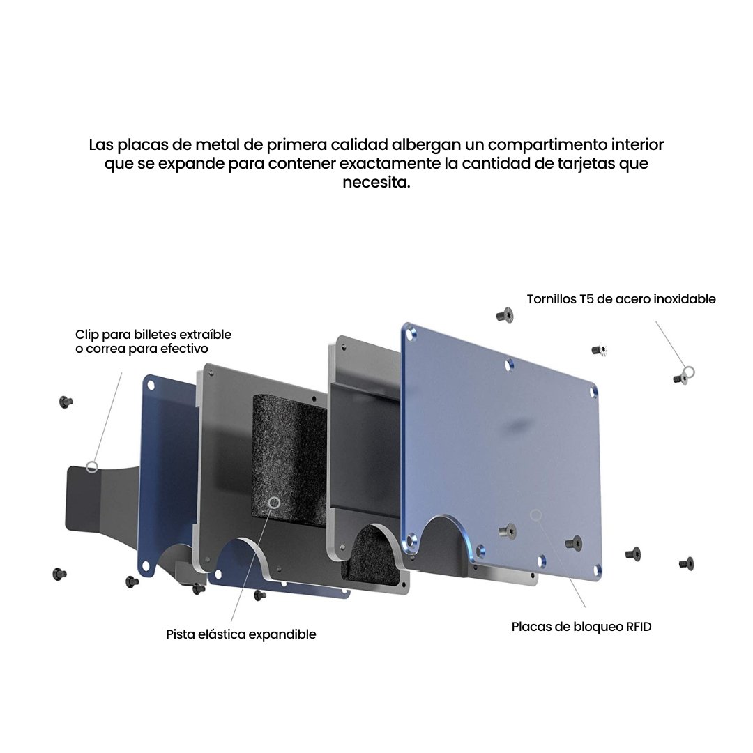 -Money Clip Exterior: Incorpora un money clip exterior, también elaborado en aluminio, que proporciona una solución práctica para asegurar billetes de forma segura y sin abultar el tarjetero.